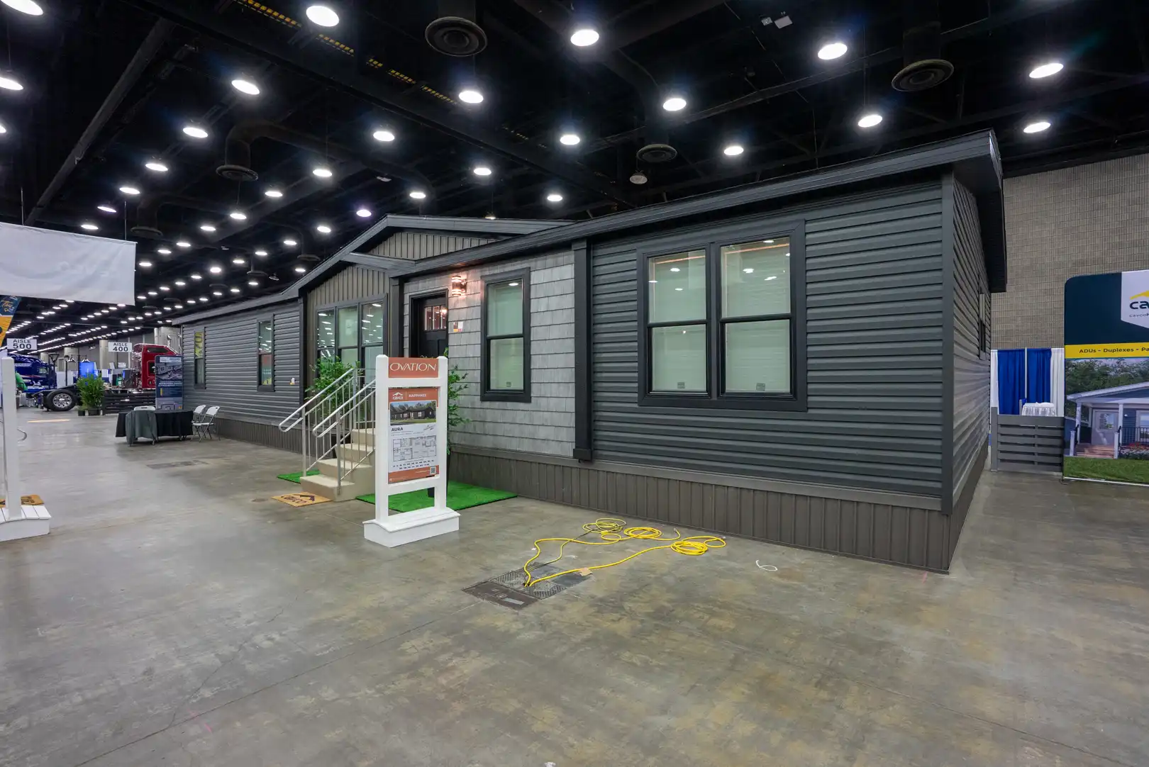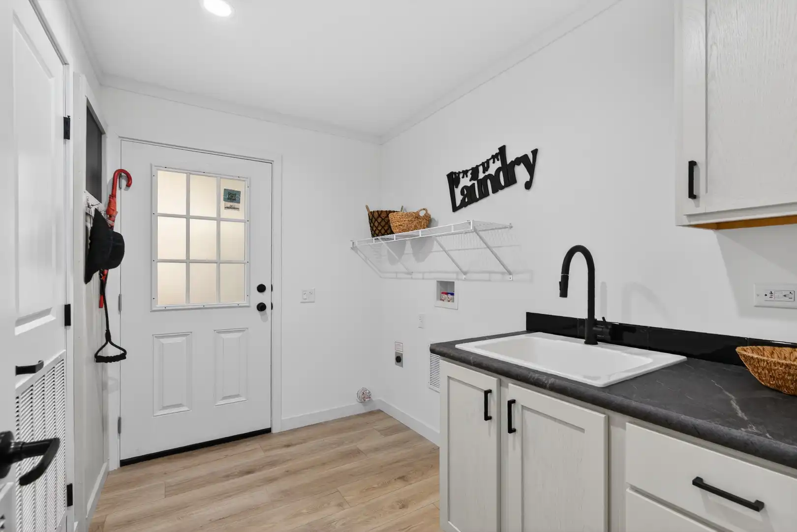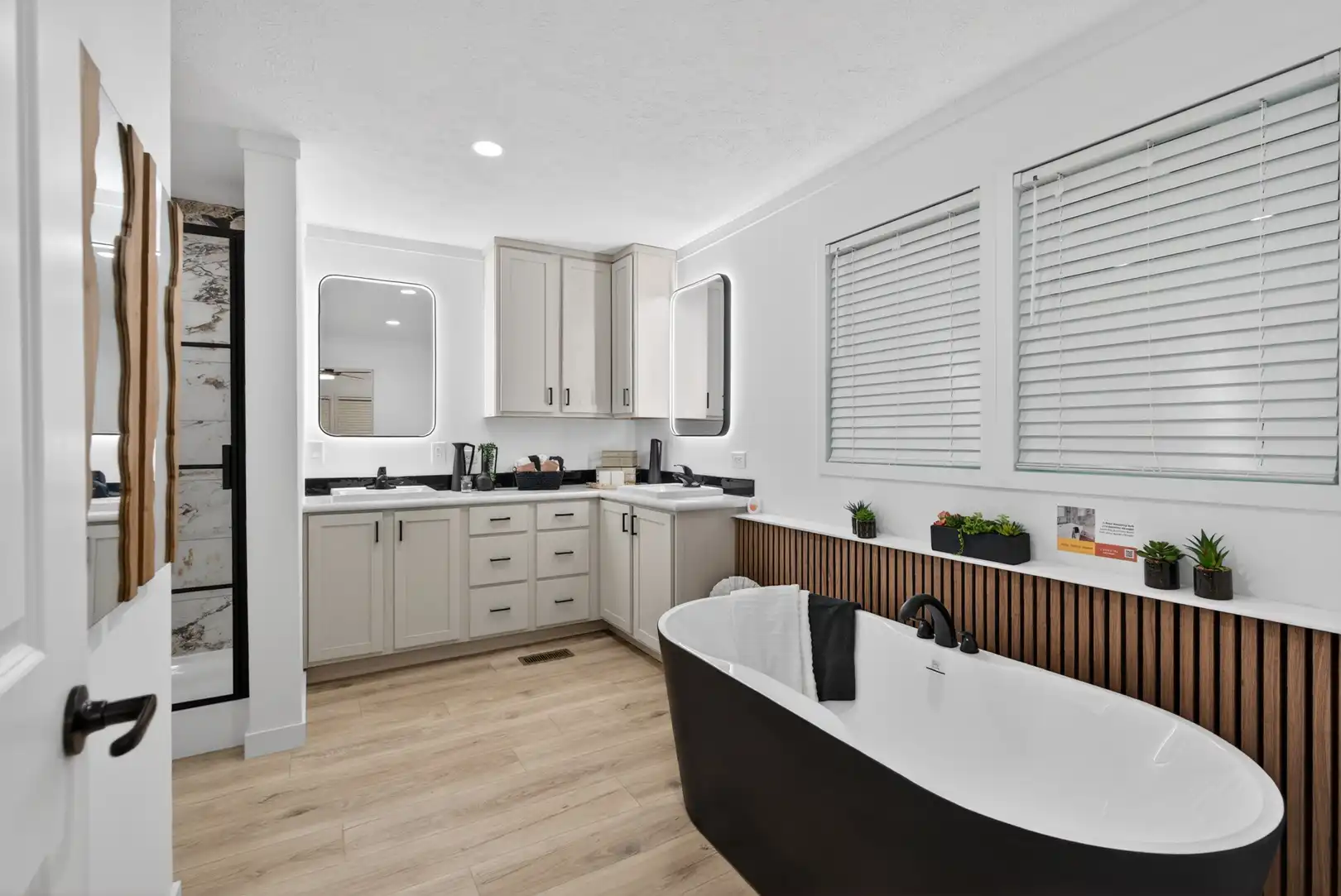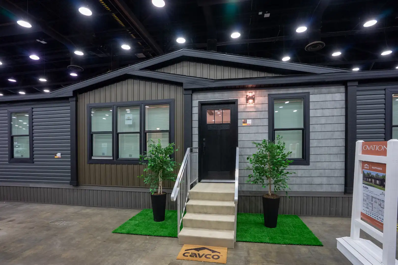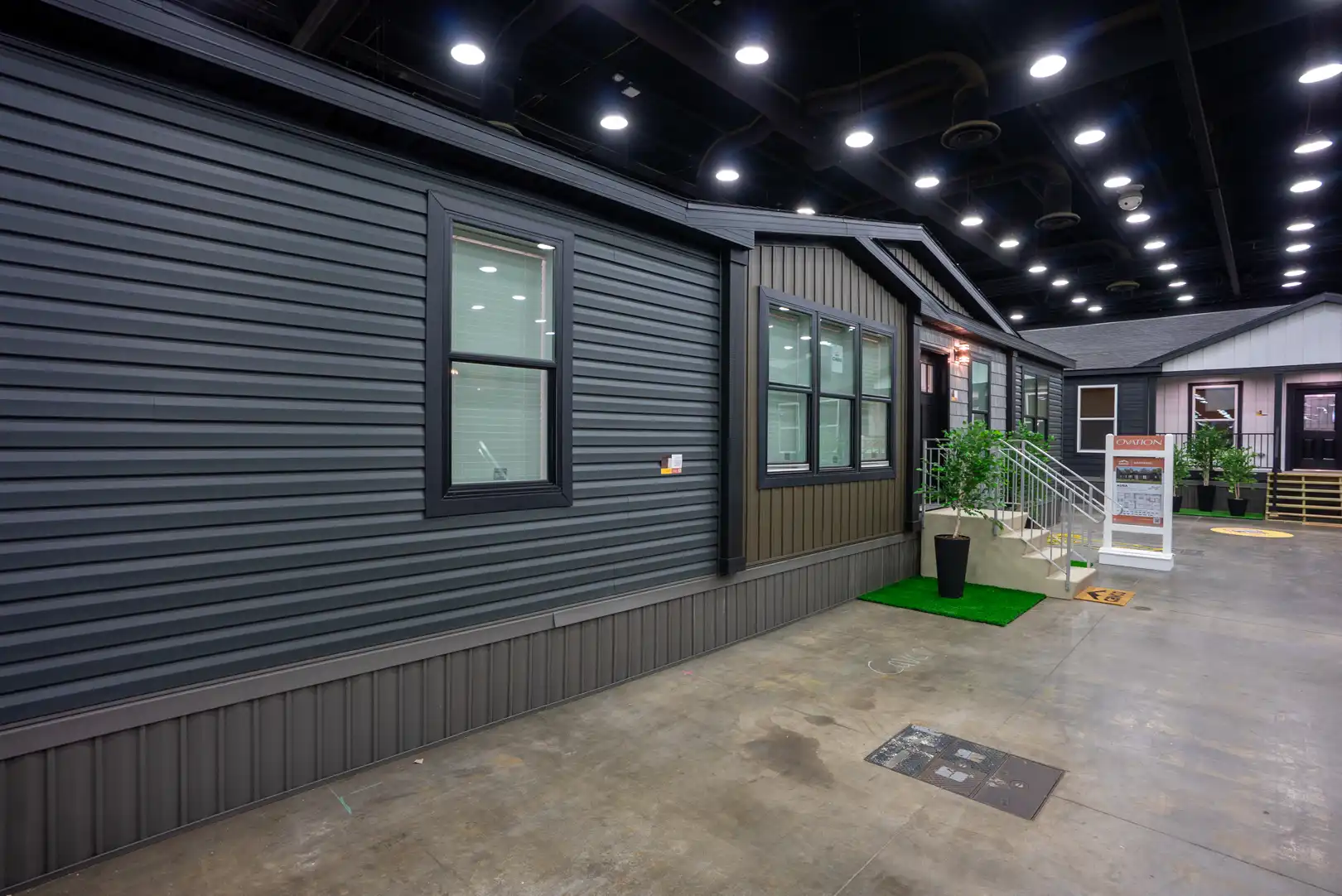 Aura 28664A / Available nationwide, The Aura by Cavco redefines everyday living with a curated balance of comfort, style and purpose. Bold black exterior tones accented with warm browns and cool greys create a striking first impression, while finished drywall and soft-close cabinetry bring a sense of calm precision inside. The kitchen, complete with black appliances, a full-wall ceramic tile backsplash and a large walk-in pantry, anchors the home in effortless function. A built-in entertainment center with an acoustic wall accent adds a touch of artistry to the main living space. With four bedrooms, three baths and walk-in closets throughout, The Aura is built around real life – where refined details, thoughtful design and everyday ease come standard.