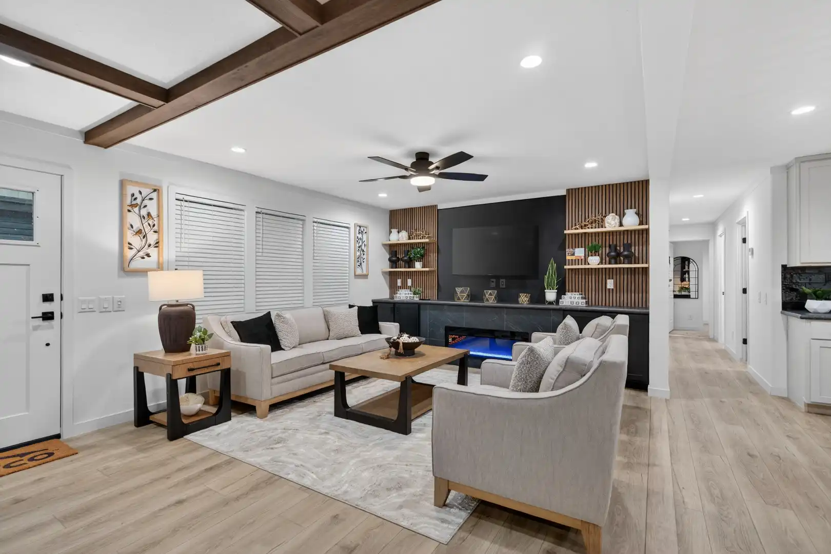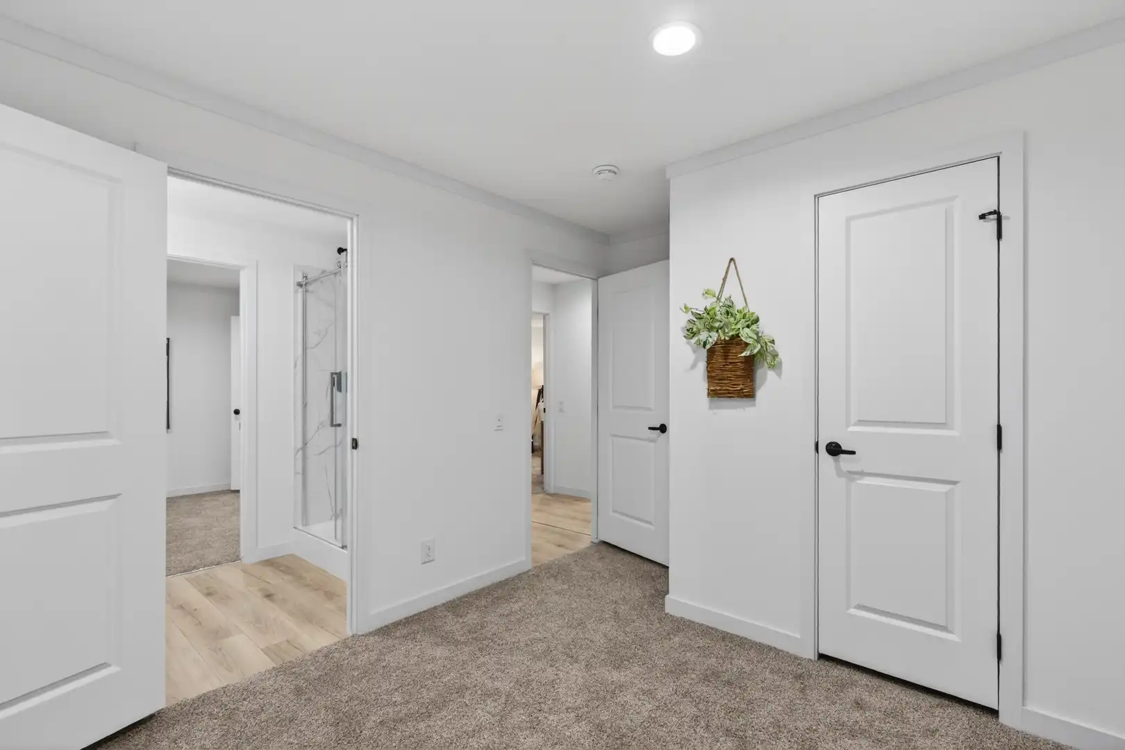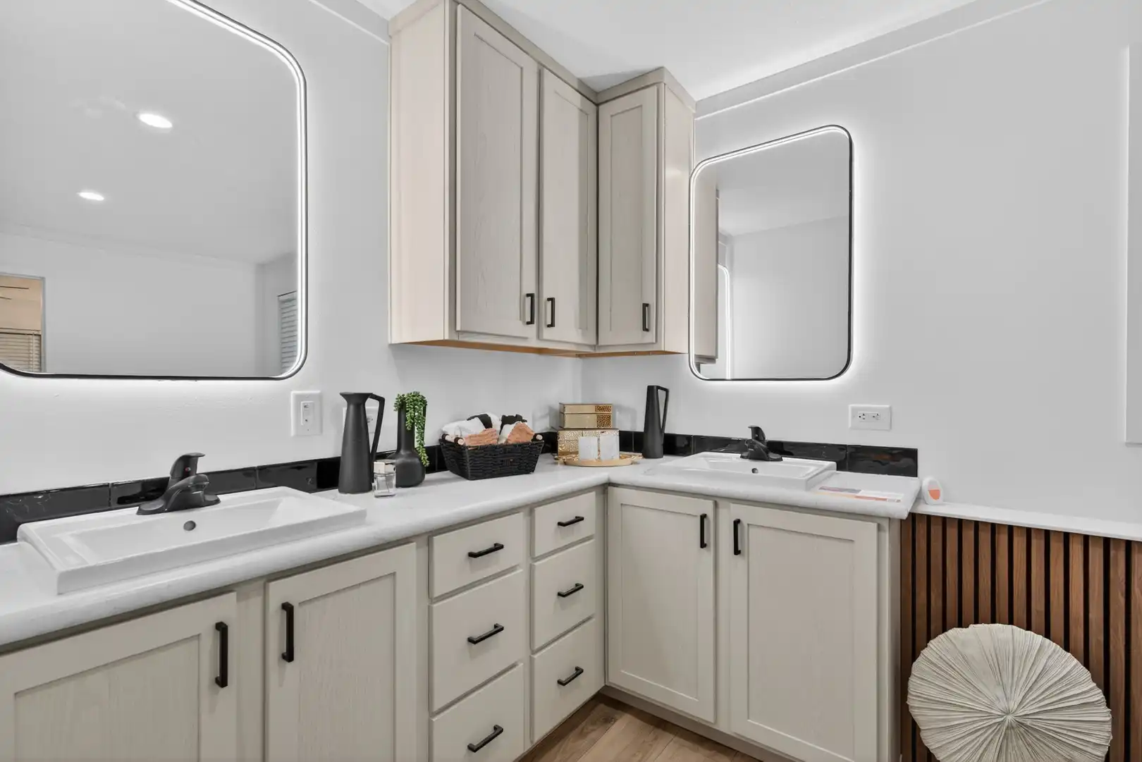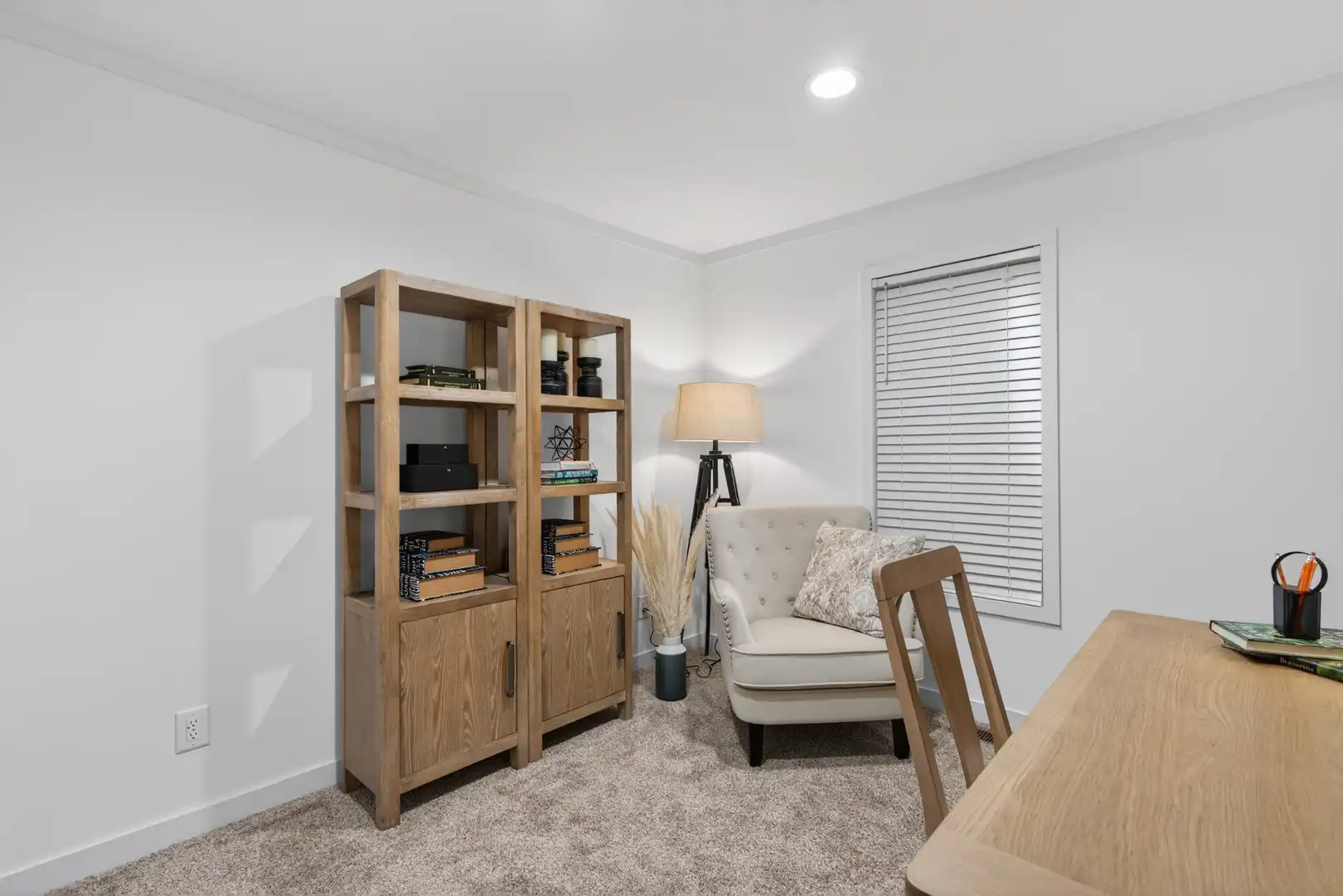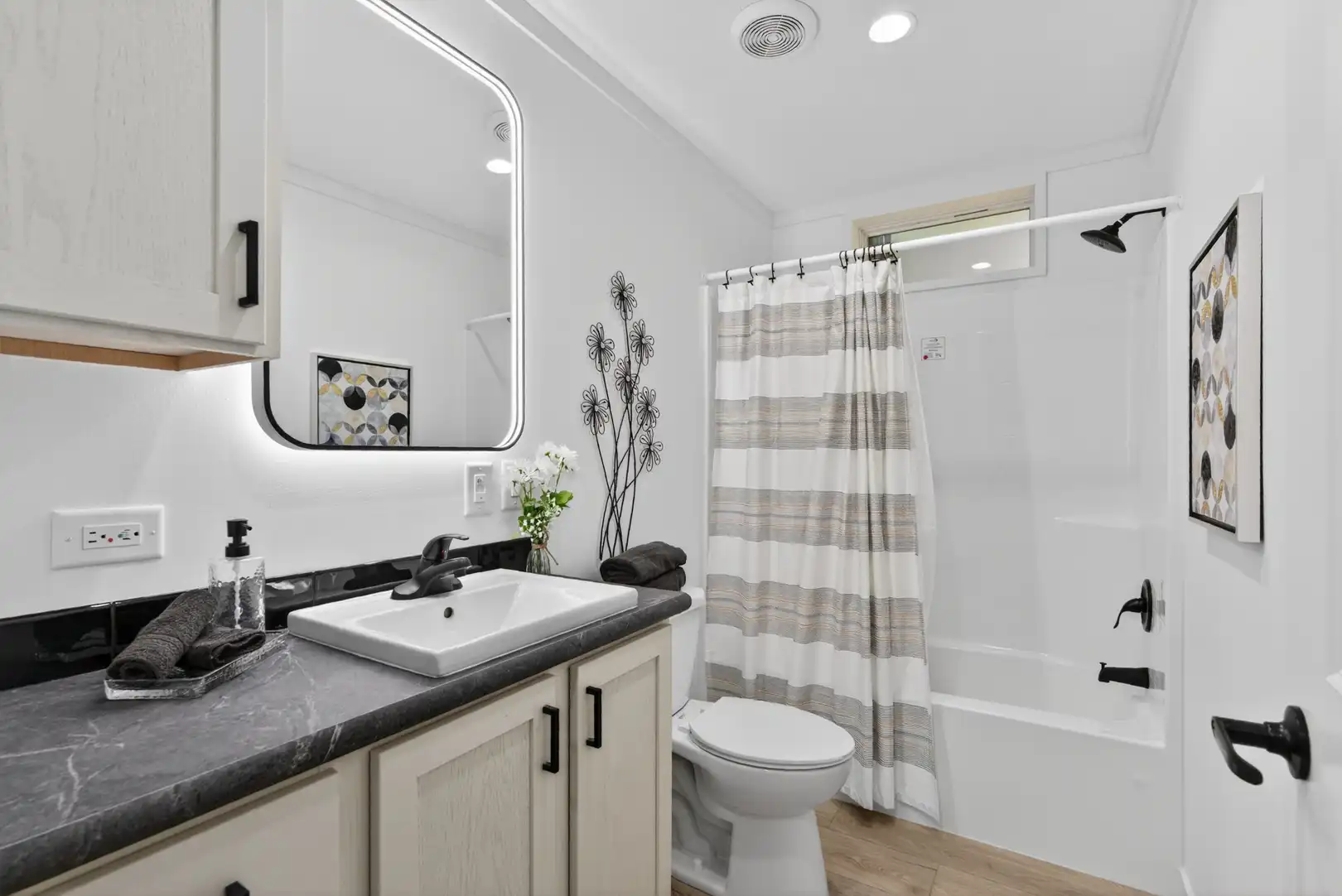 Aura 28664A / Available nationwide, The Aura by Cavco redefines everyday living with a curated balance of comfort, style and purpose. Bold black exterior tones accented with warm browns and cool greys create a striking first impression, while finished drywall and soft-close cabinetry bring a sense of calm precision inside. The kitchen, complete with black appliances, a full-wall ceramic tile backsplash and a large walk-in pantry, anchors the home in effortless function. A built-in entertainment center with an acoustic wall accent adds a touch of artistry to the main living space. With four bedrooms, three baths and walk-in closets throughout, The Aura is built around real life – where refined details, thoughtful design and everyday ease come standard.
