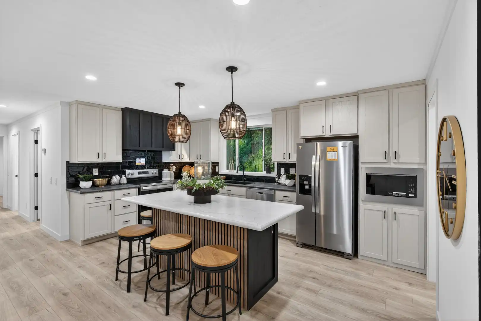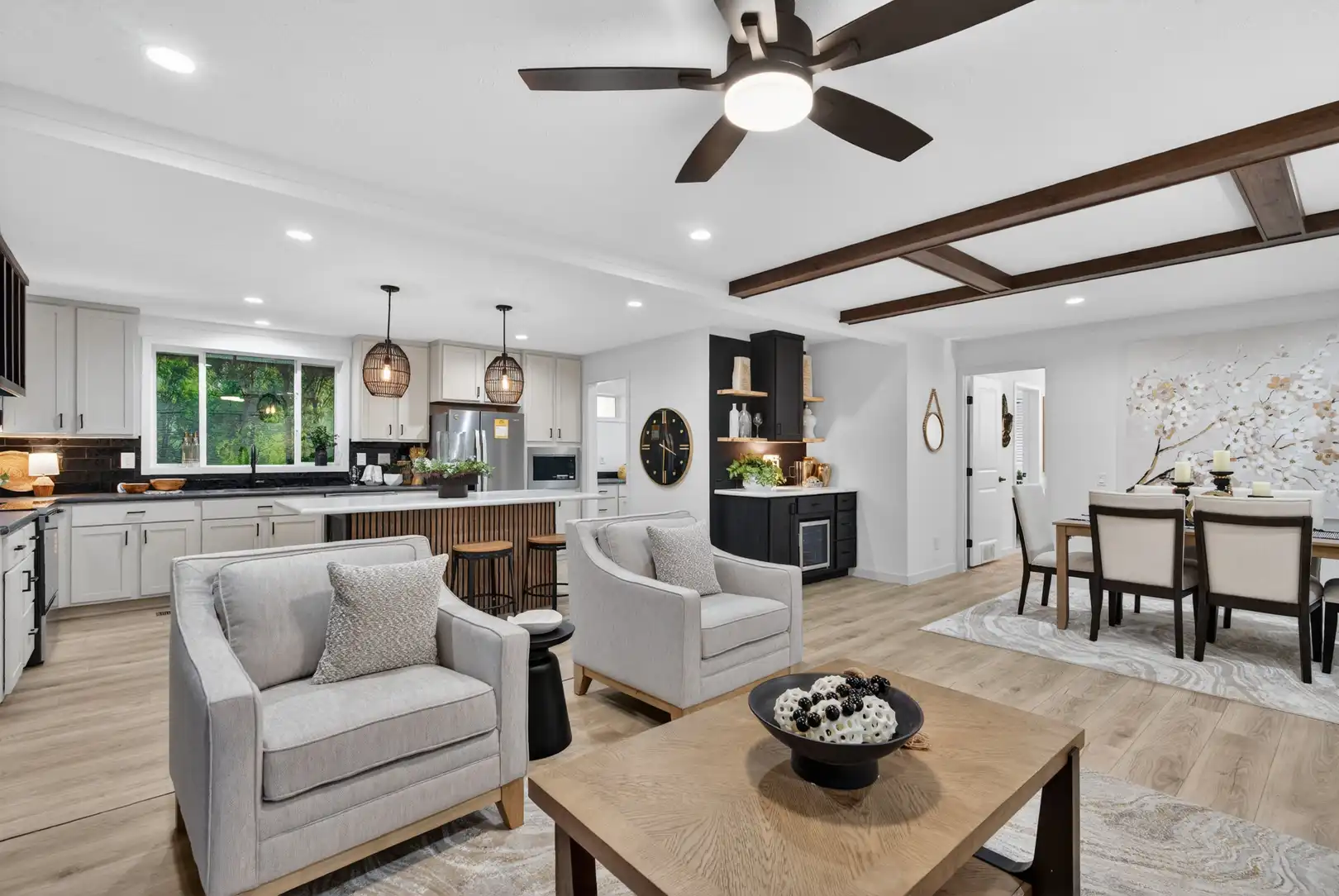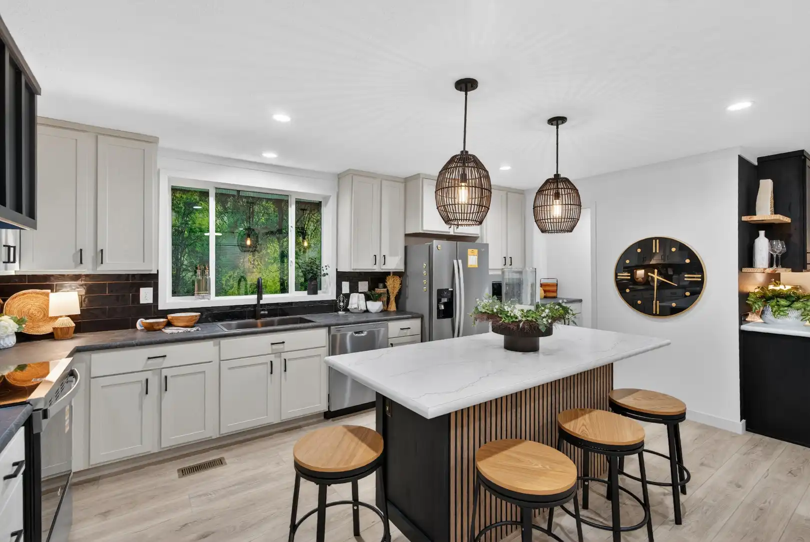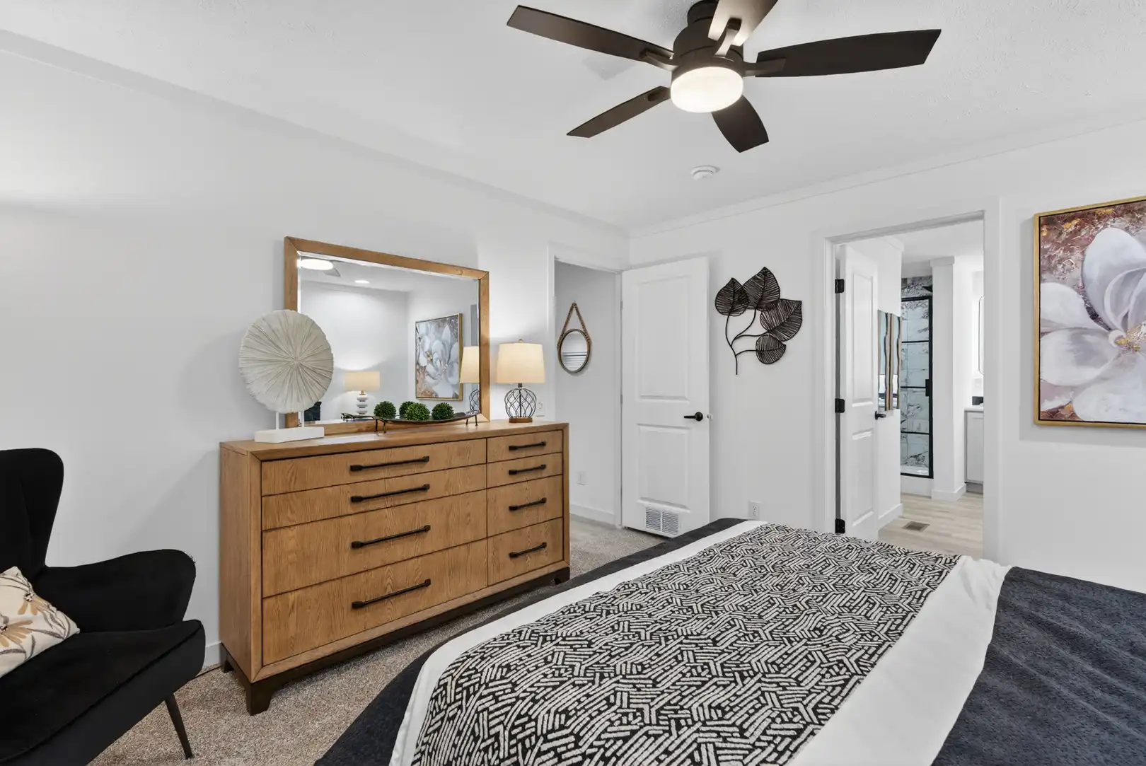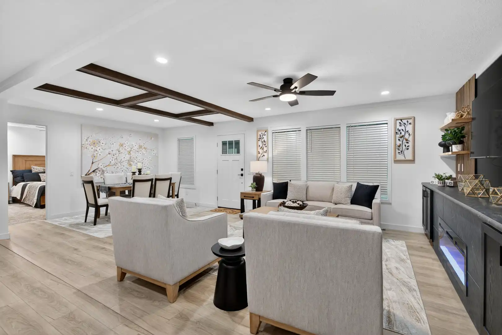 Aura 28664A / Available nationwide, The Aura by Cavco redefines everyday living with a curated balance of comfort, style and purpose. Bold black exterior tones accented with warm browns and cool greys create a striking first impression, while finished drywall and soft-close cabinetry bring a sense of calm precision inside. The kitchen, complete with black appliances, a full-wall ceramic tile backsplash and a large walk-in pantry, anchors the home in effortless function. A built-in entertainment center with an acoustic wall accent adds a touch of artistry to the main living space. With four bedrooms, three baths and walk-in closets throughout, The Aura is built around real life – where refined details, thoughtful design and everyday ease come standard.